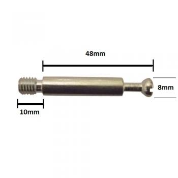 This is a 54mm capped cam bolt dowel spare part and its designed to go through 8mm holes in flat packed furniture panels.